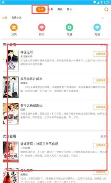 2、看小说可以切换到小说界面,还可以点击【听书】。