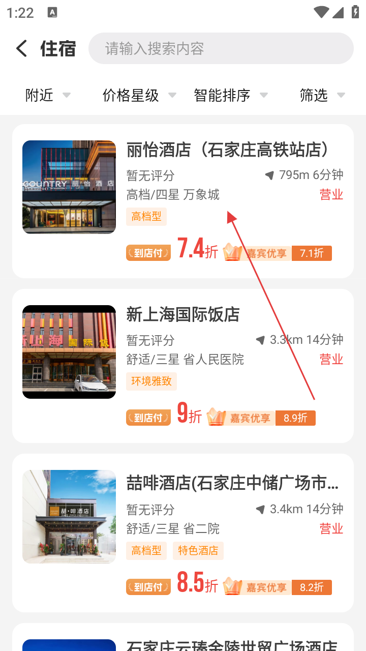 2、在住宿商家列表中,选择心仪的酒店,如丽怡酒店,点击进入酒店详情页。