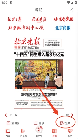 3、进到《北京晚报》版块之后,点击右下角“往期”。