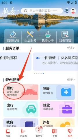 1、在“服务”版块找到“预约”,点击进入。