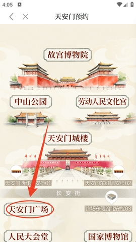 3、要预约升旗的话,就点击“天安门广场”,去这里才能预约。
