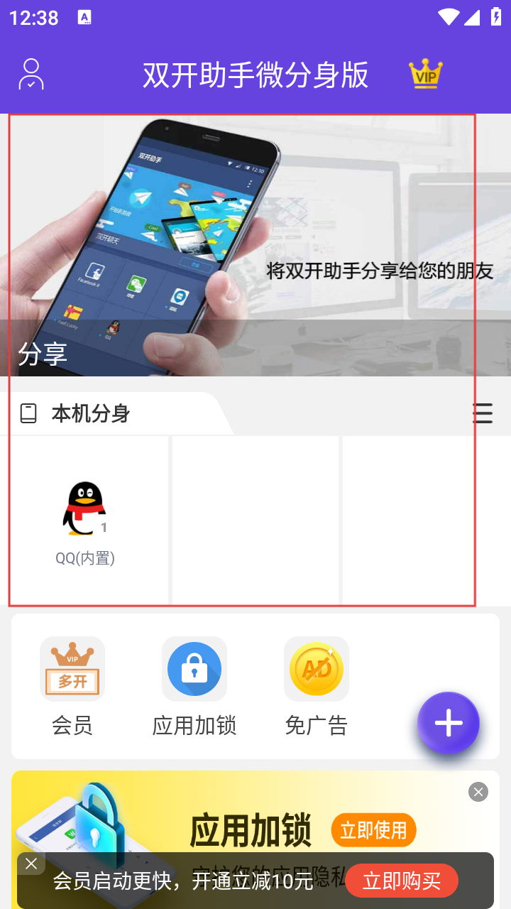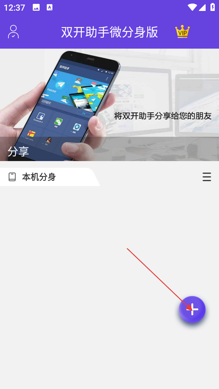 1、在【双开助手微分身版】主界面,若要添加双开应用,点击右下角的【+】按钮。