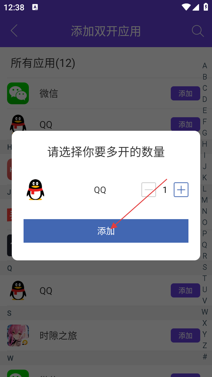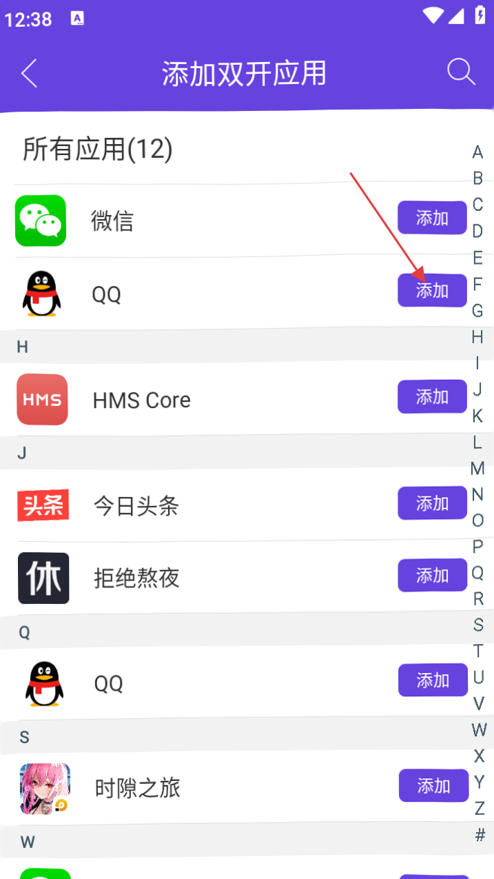 2、进入添加双开应用页面,若要双开QQ,点击QQ旁的【添加】按钮。