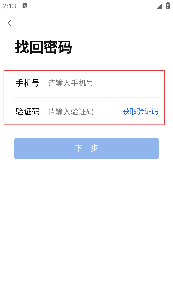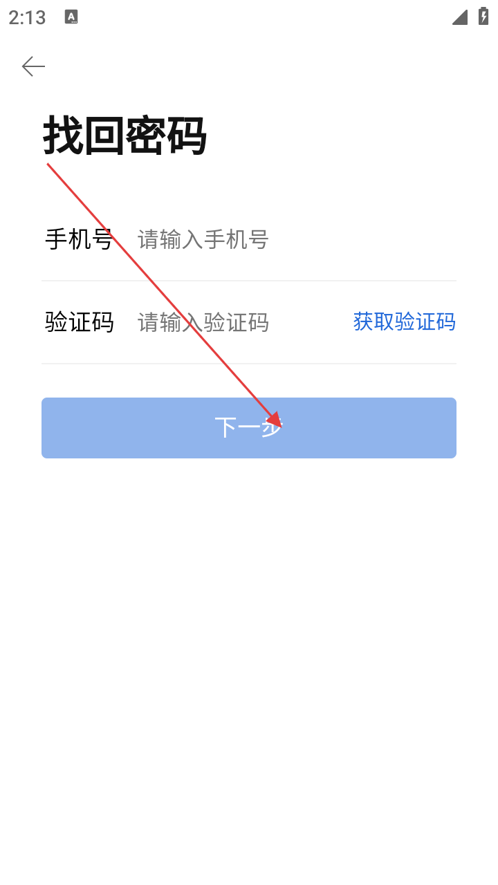 2、找回密码页,输入手机号,点【获取验证码】填后,点【下一步】。