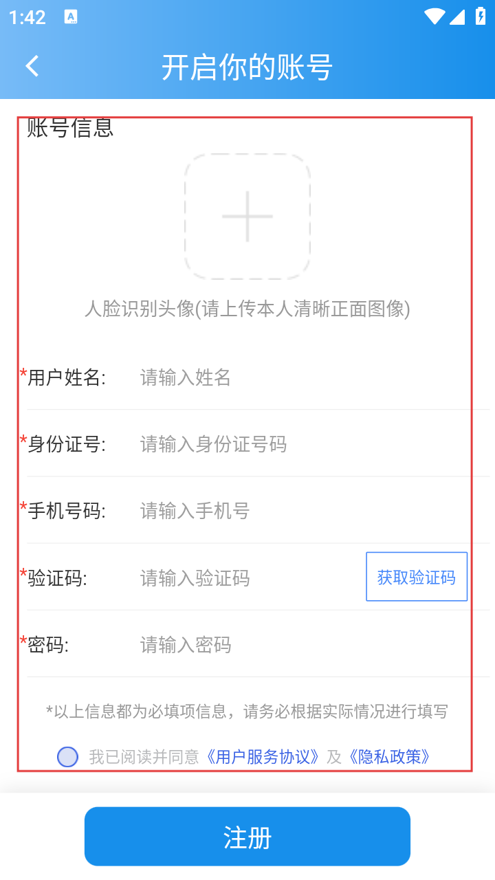4、按注册页要求,上传人脸识别头像,填姓名、身份证号等信息,勾选协议后点【注册】完成账号注册。