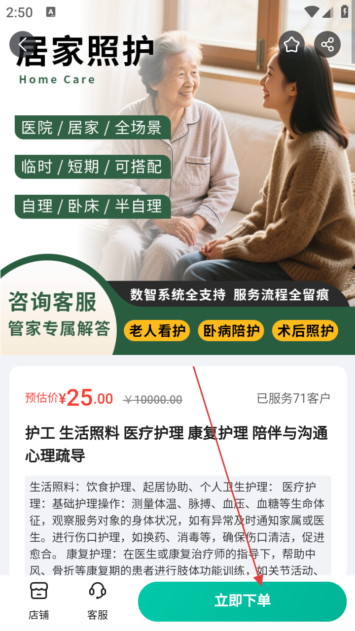 3、确认居家照护服务,点【立即下单】,进入下单流程。