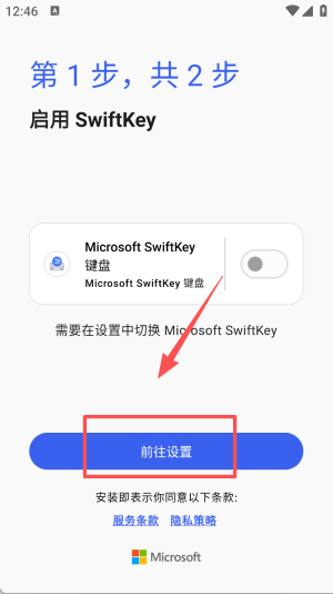 1、启用 Microsoft SwiftKey 时,点击前往设置按钮,在设置中开启其键盘功能。