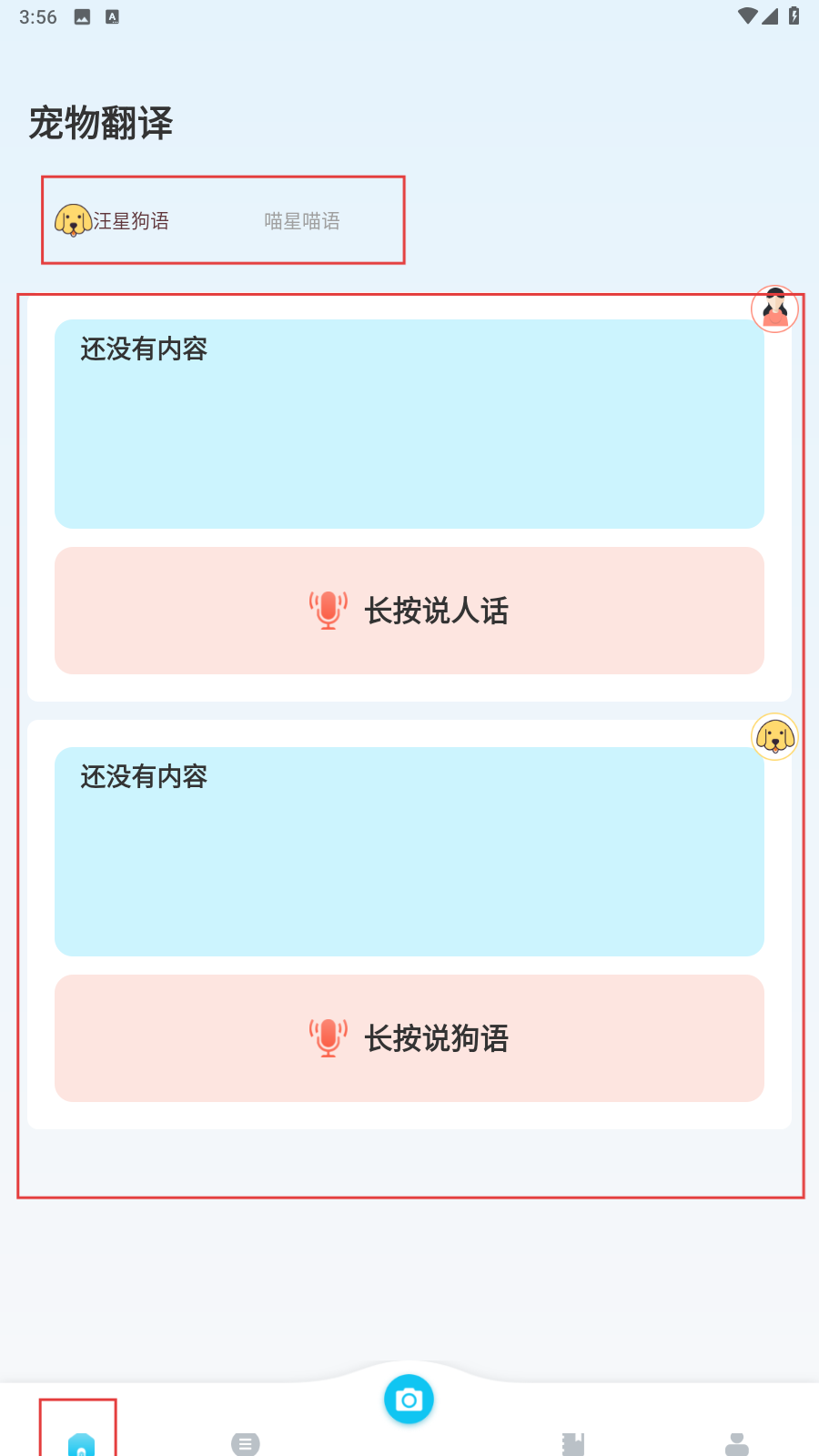 1、打开应用,首页可以进行宠物语音翻译。