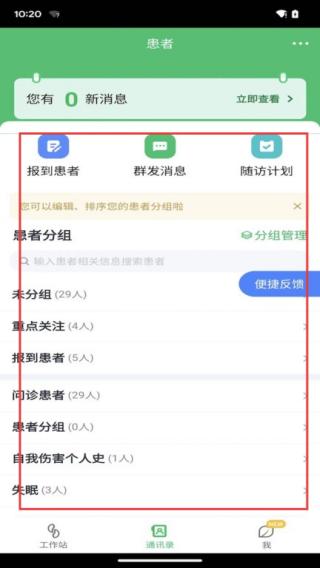 4、患者管理系统:按病种、就诊时间等多维度分类患者,建立结构化健康档案,支持批量随访提醒。