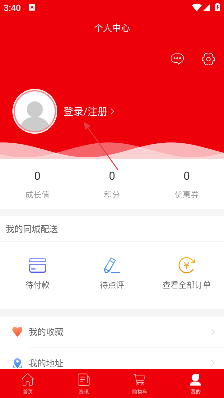 2、在个人中心页面,点击【登录/注册】区域,进入账号密码登录页面。