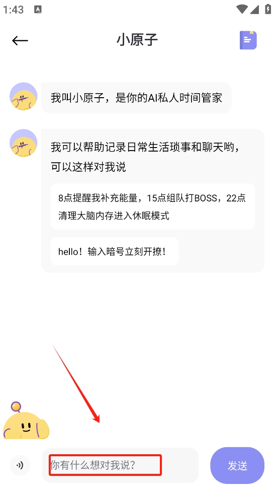 2、在对话框中输入指令,例如“你有什么想对我说?”以与AI助手互动。
