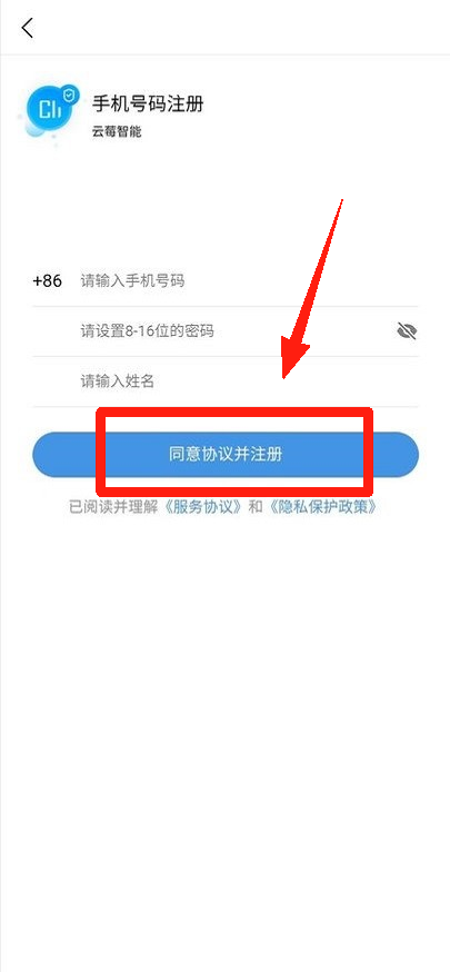 1、在注册页面输入手机号、密码和姓名,点击“同意协议并注册”按钮完成注册。