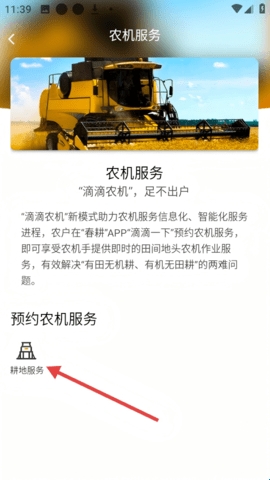 2、在农机服务页面,点击【耕地服务】选项,可进入耕地服务页面。
