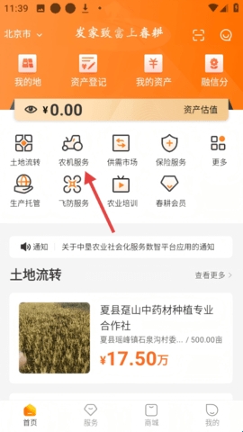 1、在首页点击【农机服务】选项,可进入农机服务页面。