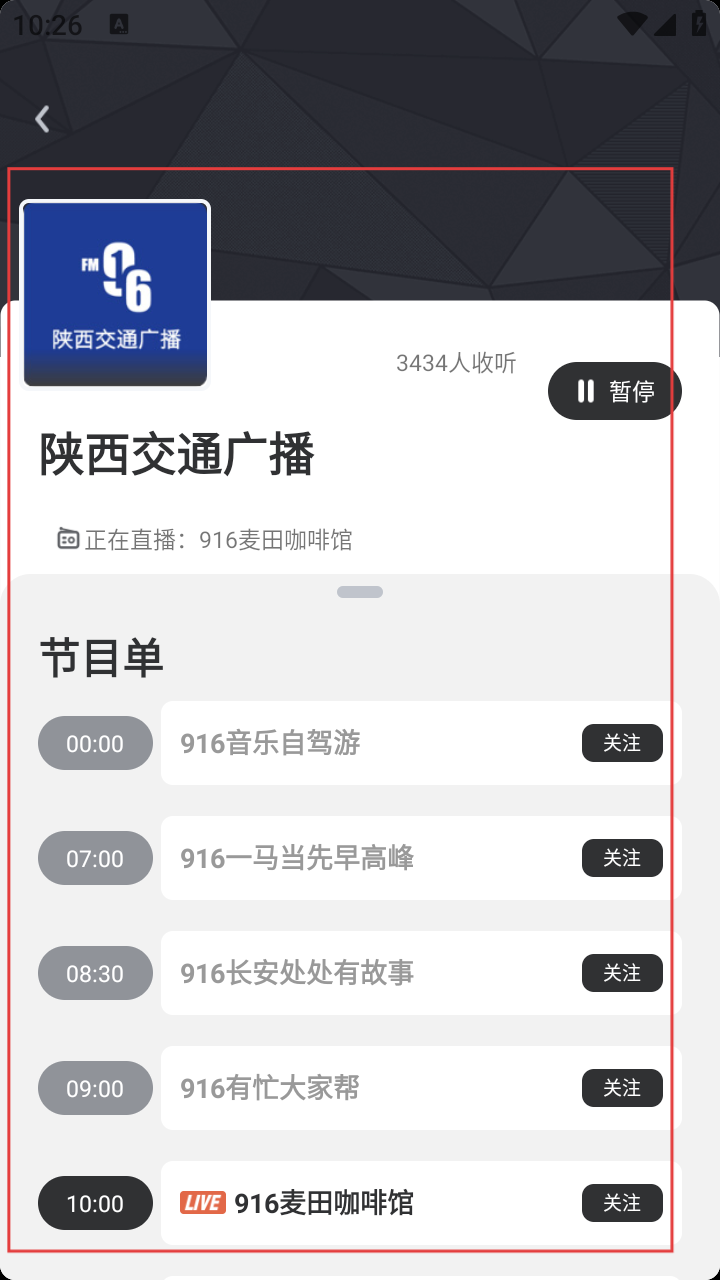 4、进入频道播放页,以陕西交通广播为例,可听直播如916麦田咖啡馆,还能查看节目单,按需关注节目。