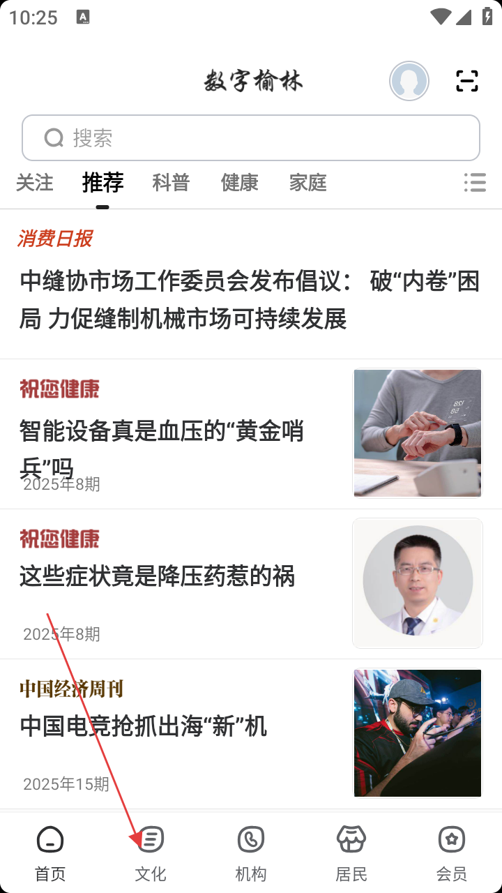 1、在【数字榆林】首页,想找文化类内容,点击底部【文化】按钮,进入文化板块探索资源。