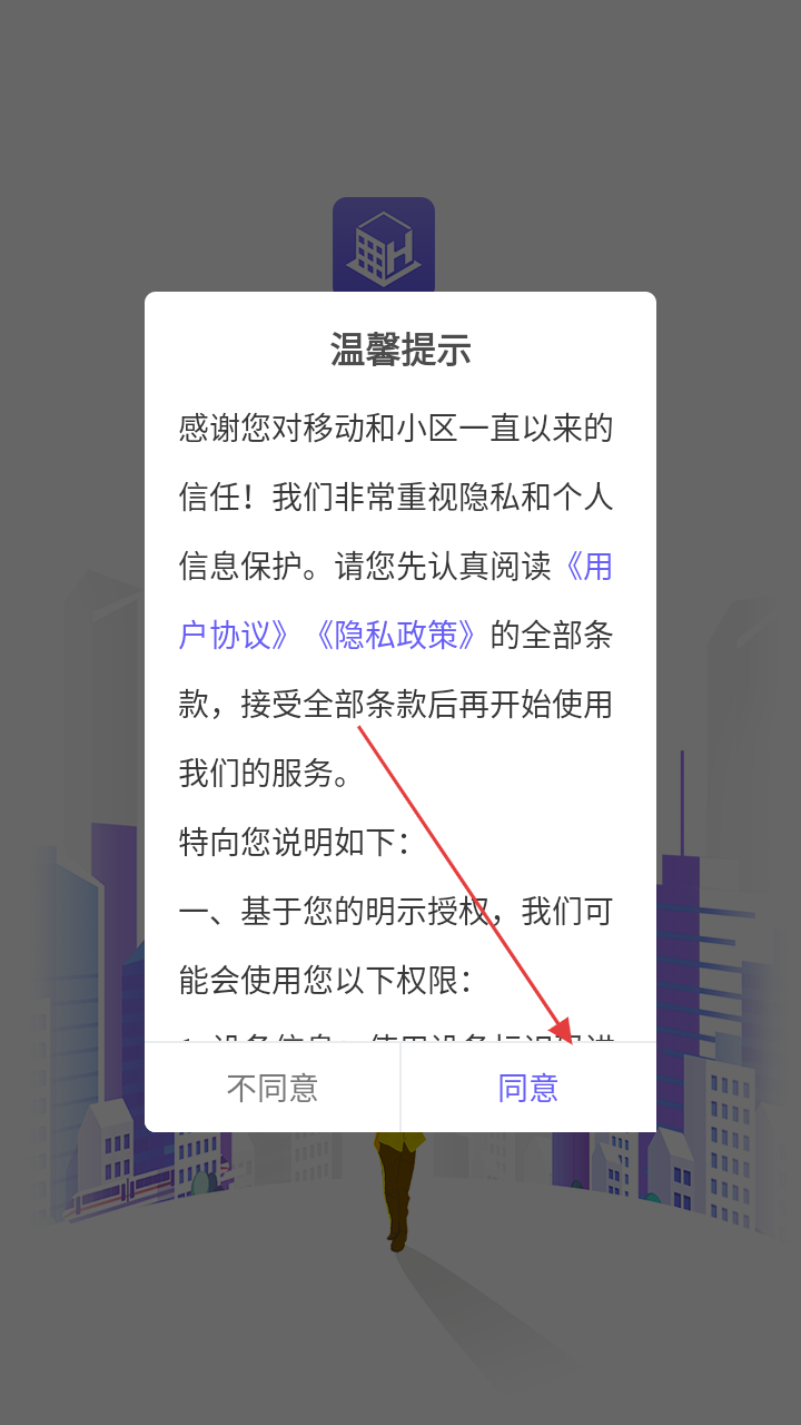1、打开移动和小区,阅读《用户协议》《隐私政策》后,点击【同意】,开启使用流程。