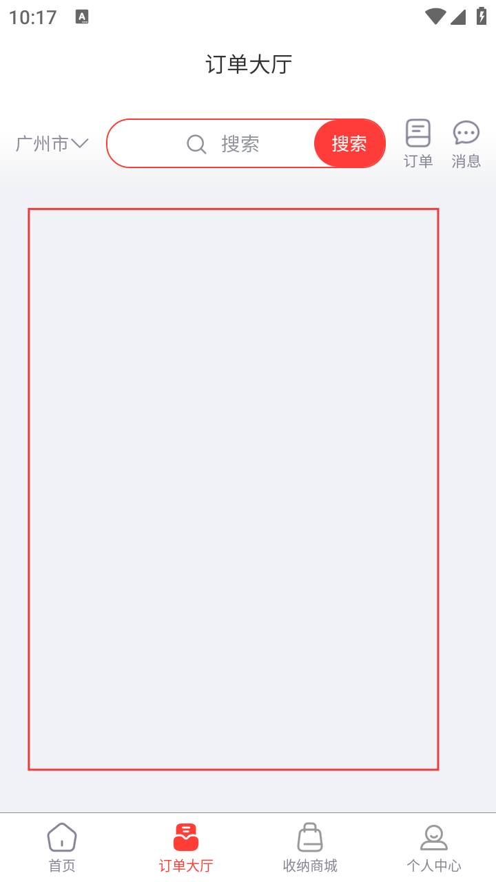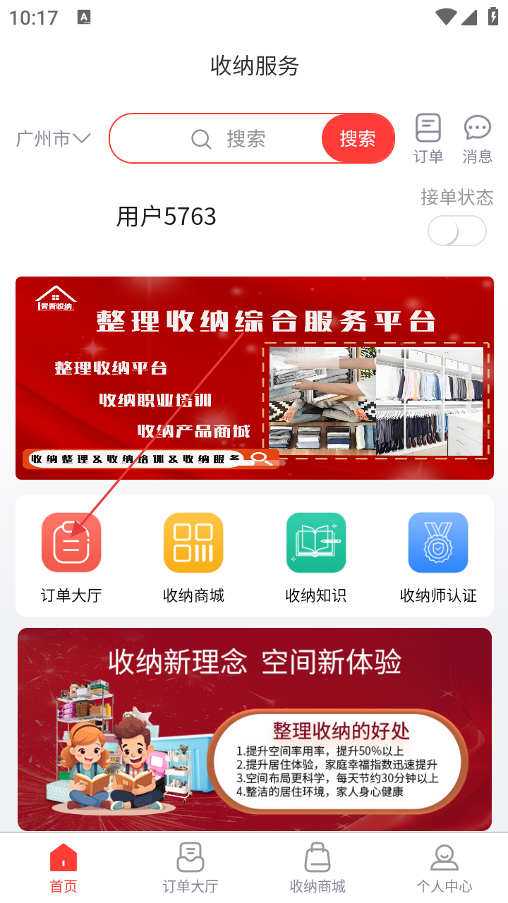 3、登录成功后,进入【收纳服务】首页,点击底部【订单大厅】图标进入订单页面。