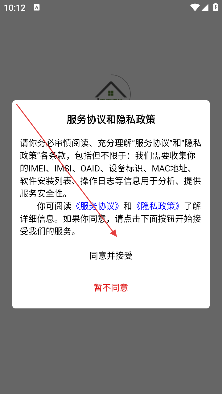 1、打开【青青收纳师】应用,出现【服务协议和隐私政策】弹窗后,点击【同意并接受】。