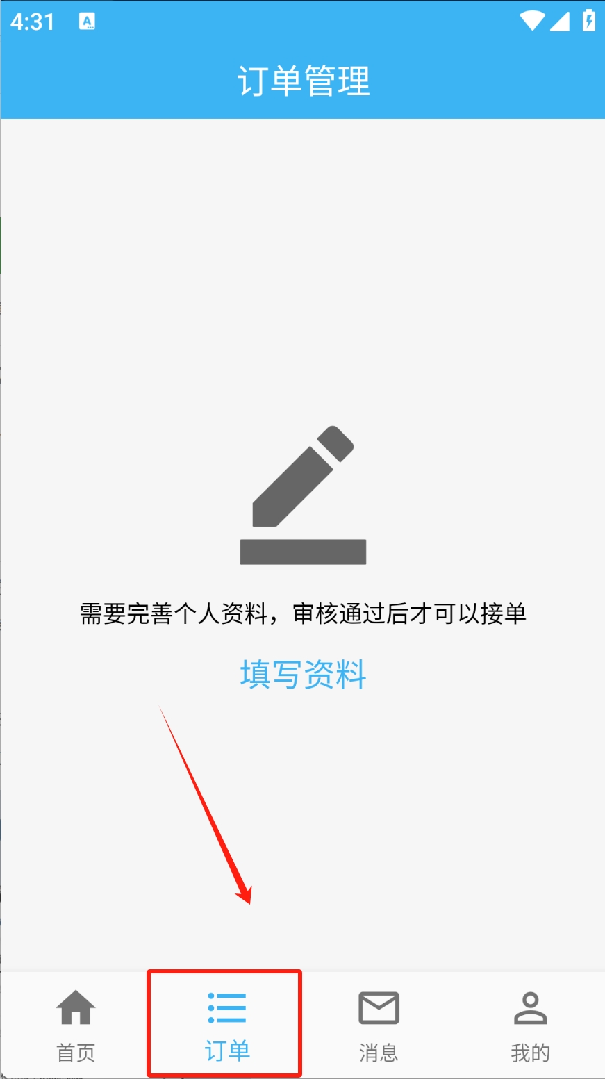 2、在订单管理页面,点击“填写资料”完善个人信息。