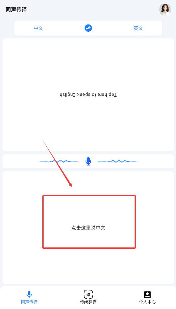 1、在对话场景中点击麦克风图标,说出需翻译的内容,软件将同步输出目标语言文本及语音播报。