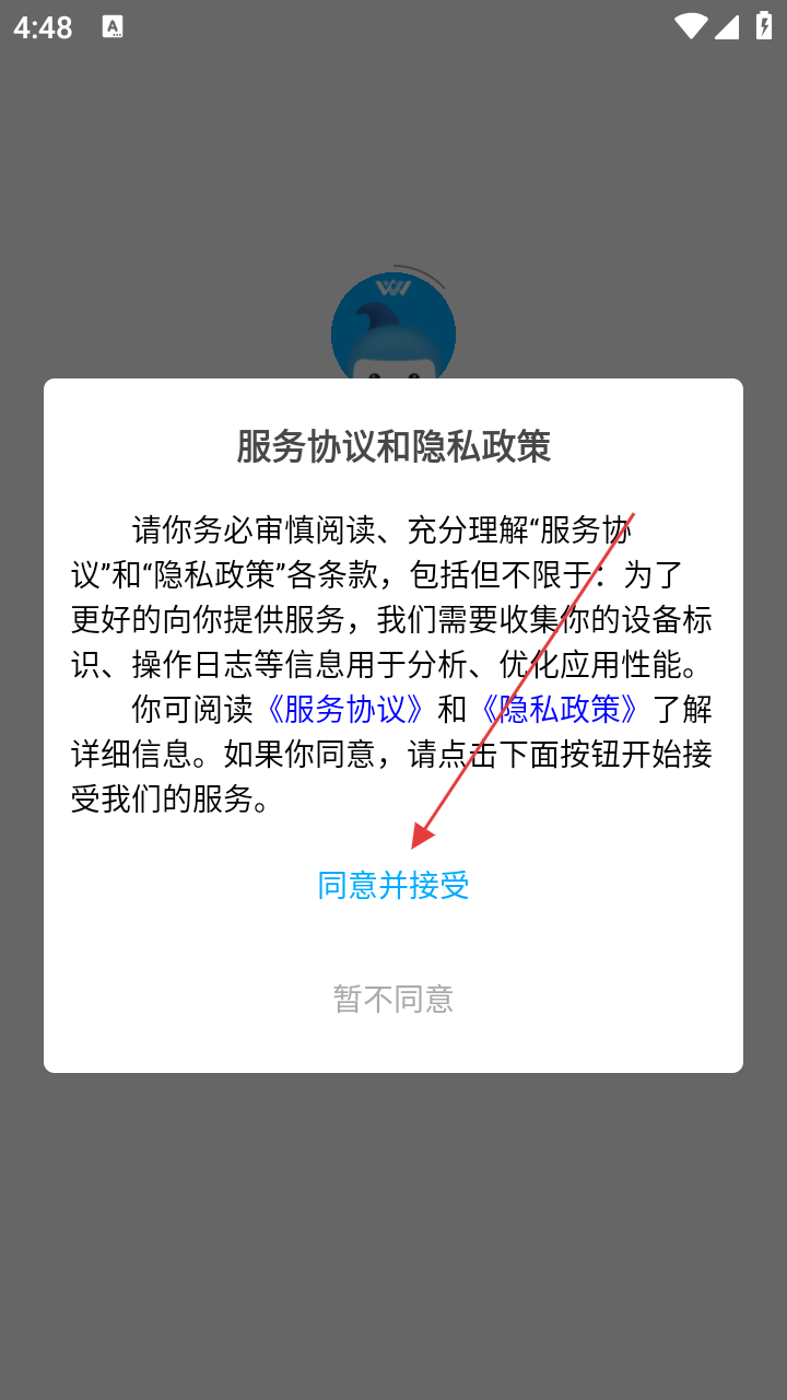 1、首次打开应用,阅读【服务协议和隐私政策】后,点【同意并接受】。