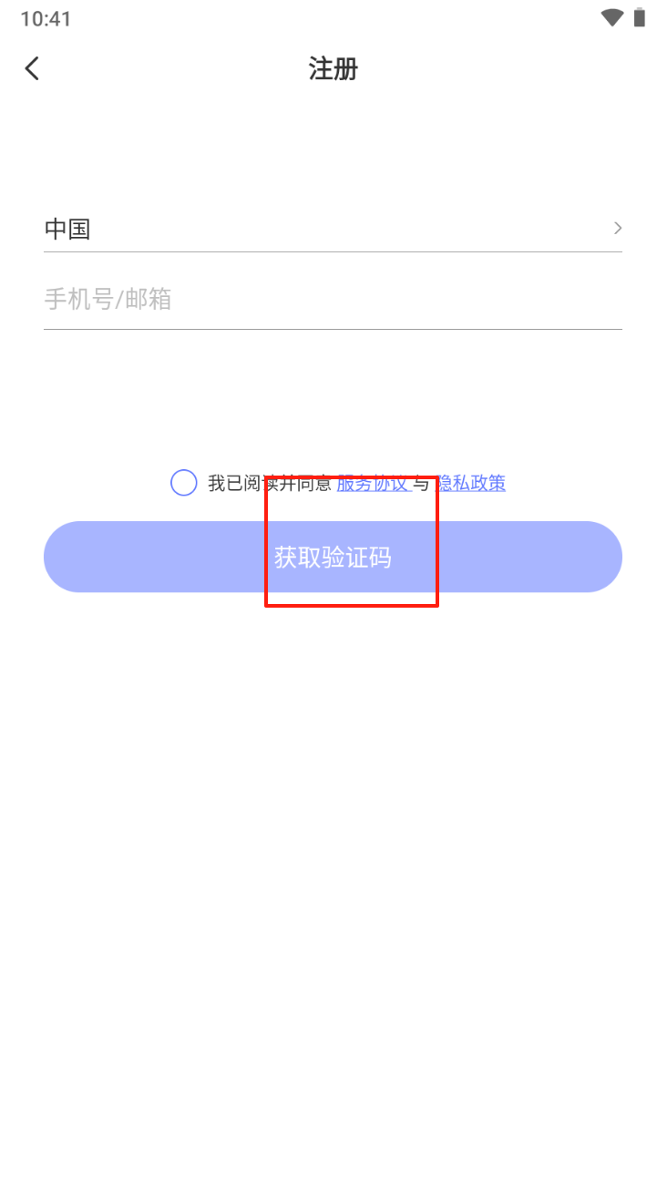 4、勾选同意服务协议与隐私政策,点击“获取验证码”以完成注册。