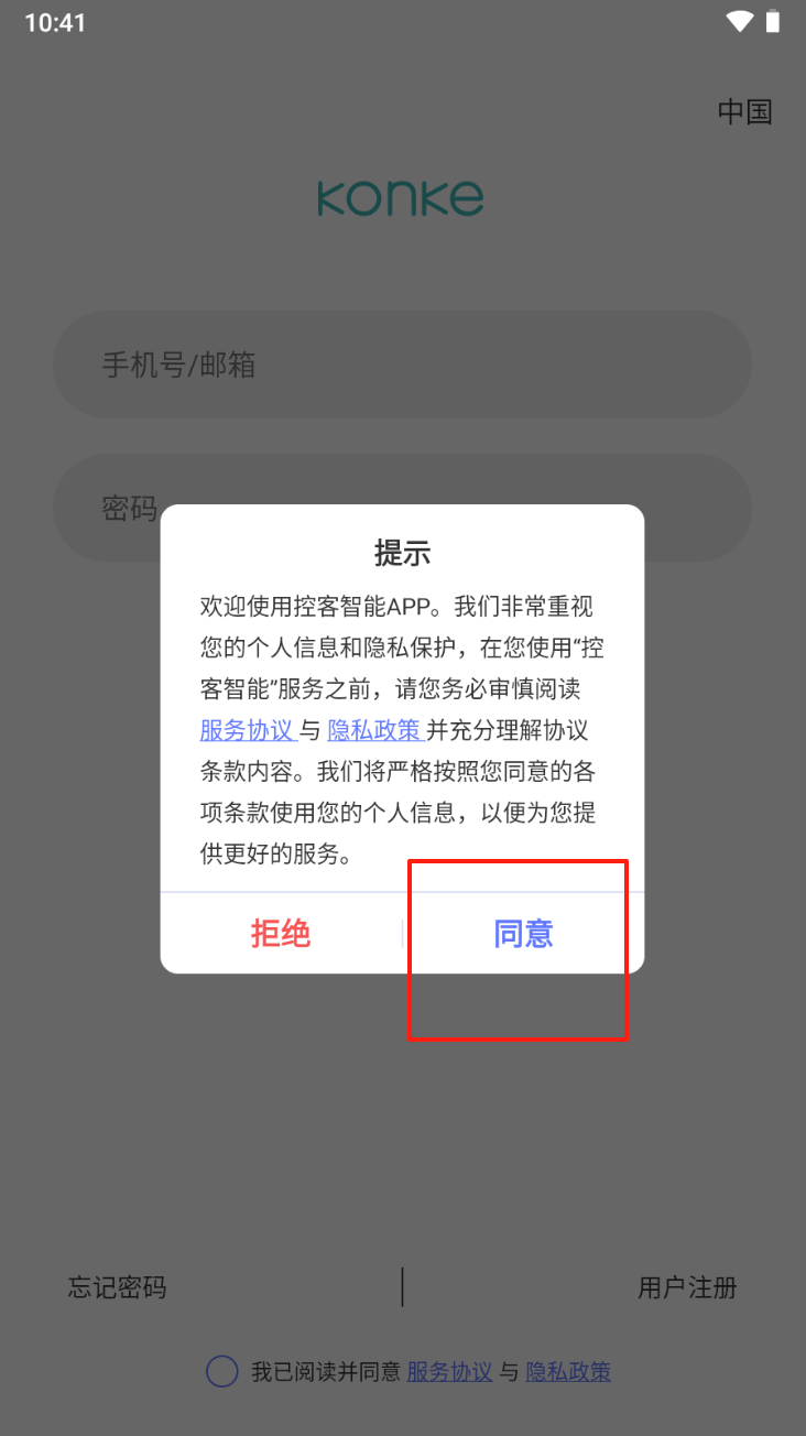 2、阅读并同意服务协议与隐私政策,点击“同意”。