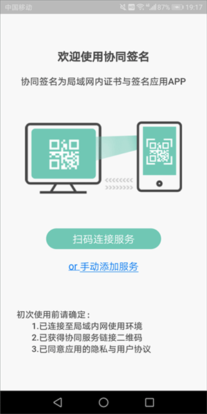 1、打开,点击扫码连接服务扫取已获得的协同服务链接的二维码