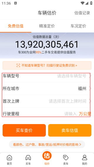 4、填完车辆信息后,点击【卖车估值】按钮,获取车辆卖车估值结果,辅助卖车决策。