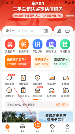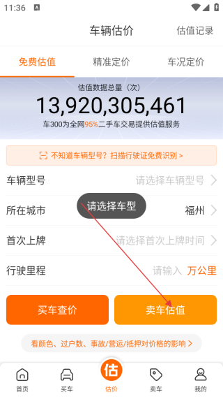 1、进入车300首页,可利用【免费高价卖车】【车辆估价】等功能,点击【车辆估价】。