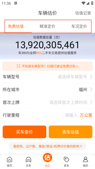 2、进入【车辆估价】页面,选择【免费估值】【精准定价】【车况定价】分类,按需进行车辆价值评估。