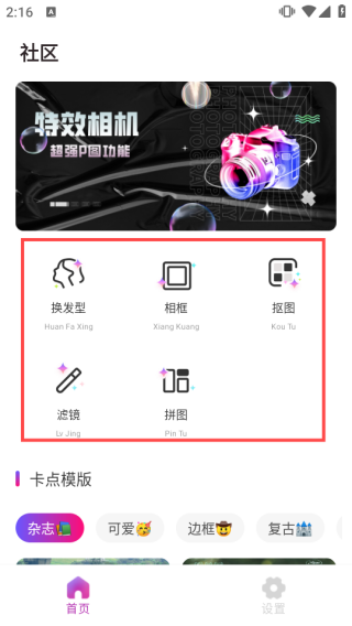 1、打开软件,根据需要点击使用换发型、相框、抠图、滤镜、拼图不同功能。