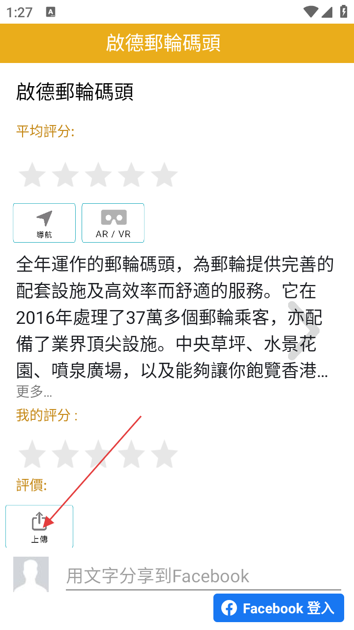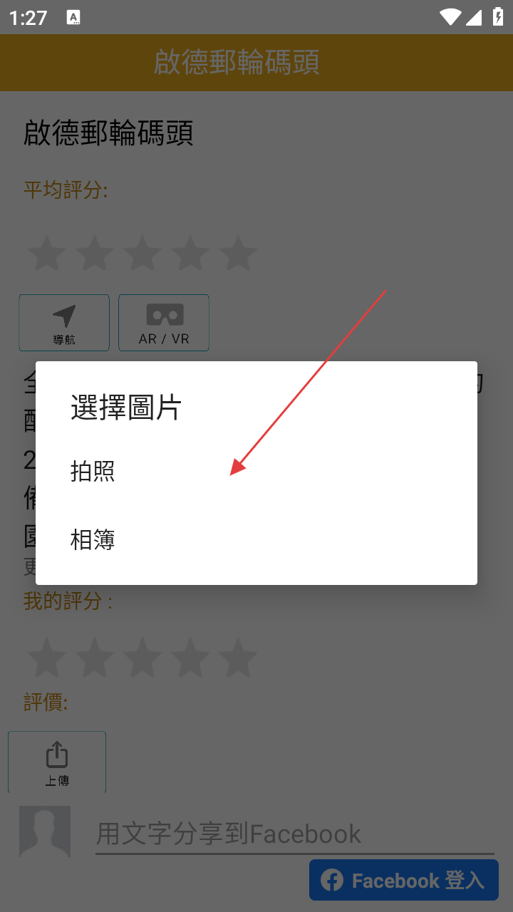 3、在“啟德郵輪碼頭”详情页面,点击【上傳】按钮,弹出【選擇圖片】选项框,可选择“拍照”或“相簿”来上传图片。