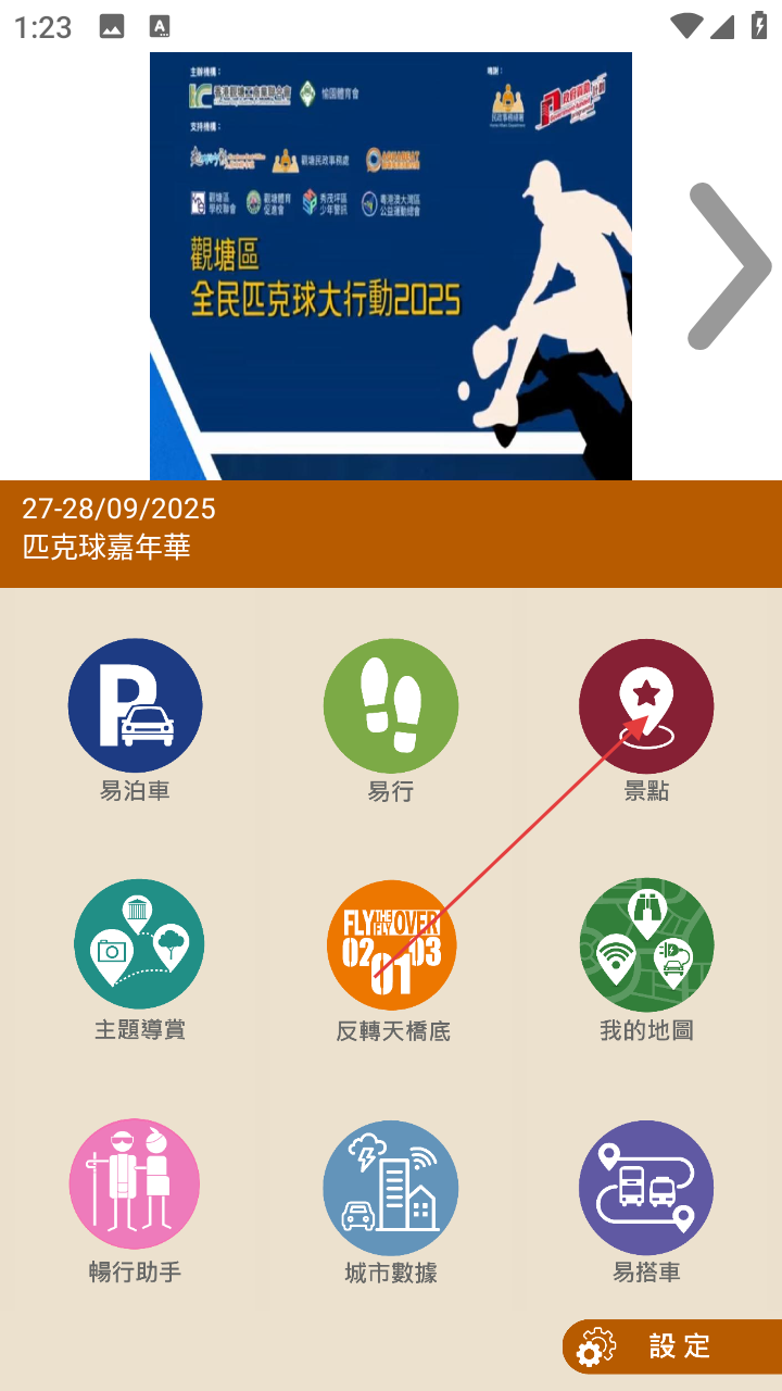 1、打开我的九龙东APP,进入首页后,点击【景點】选项,进入景点分类页面。