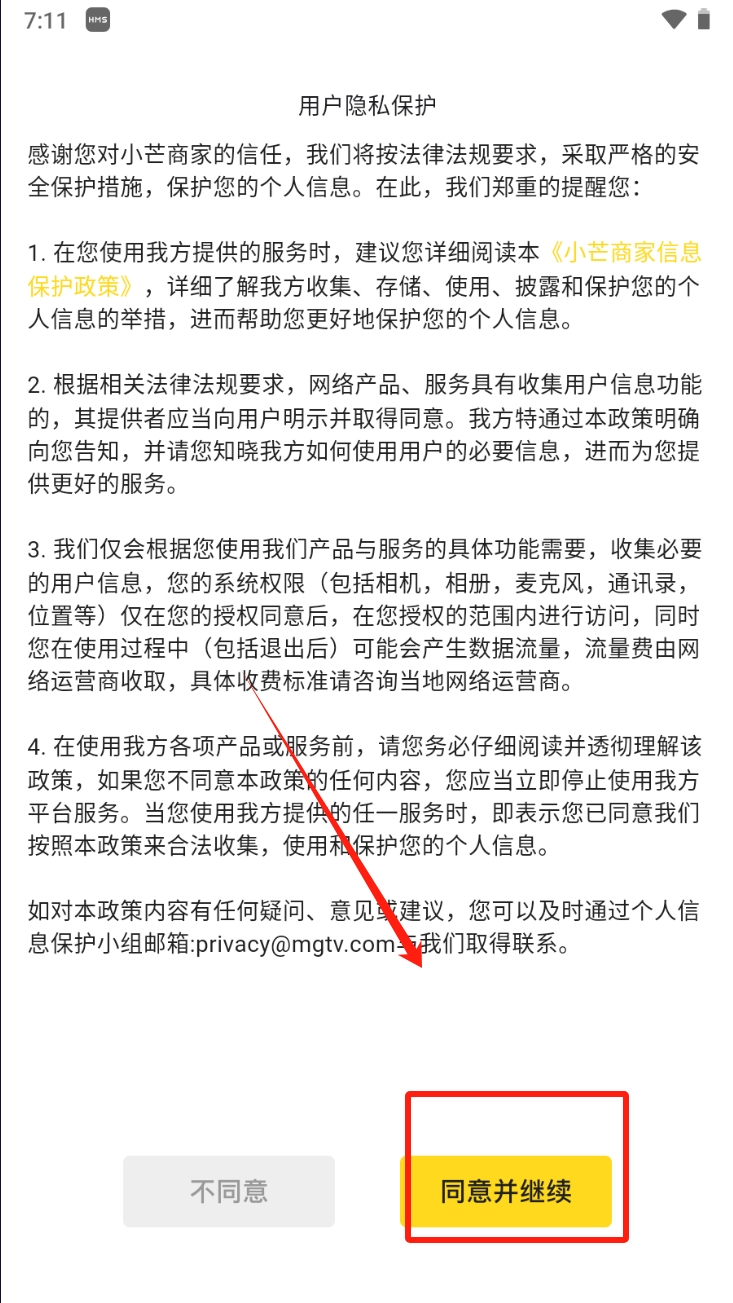 1、在用户隐私保护界面,阅读相关条款后点击“同意并继续”。这是使用小芒商家服务前的必要步骤,确保您了解并同意隐私政策。