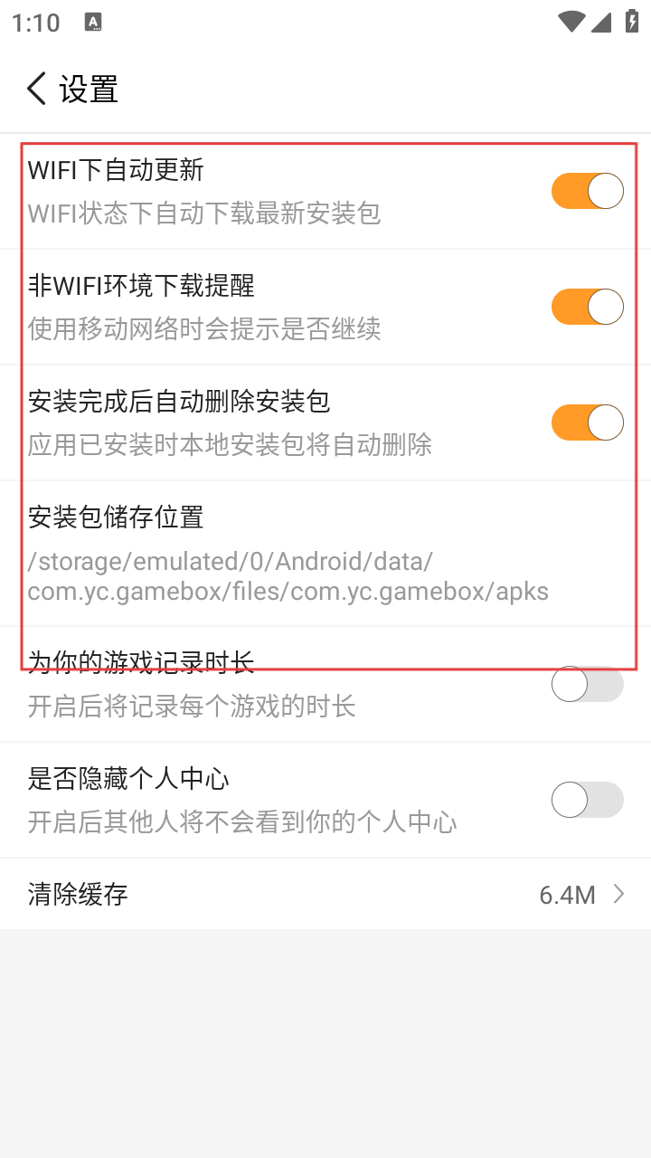 4、开启自动删除安装包功能后,应用安装完成时本地安装包将自动删除,同时可查看其他设置项如WIFI下自动更新等的状态。