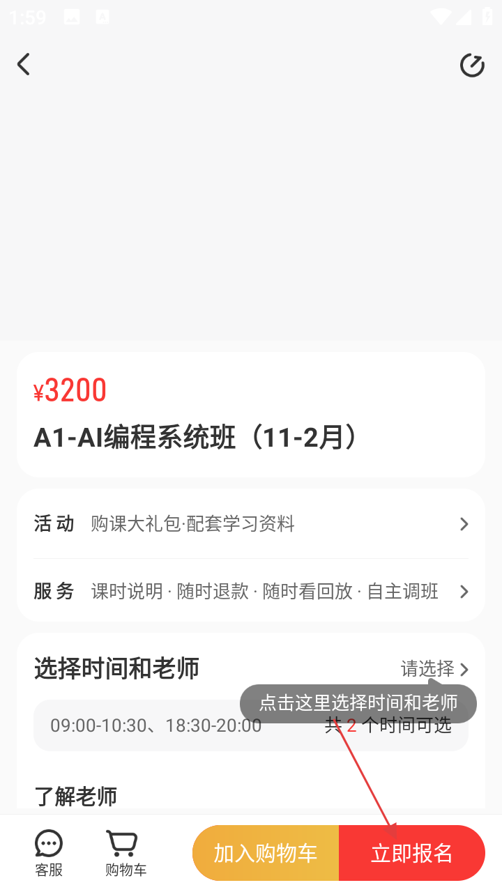 3、在课程详情页,可查看课程价格、活动、服务等信息,点击【立即报名】进入登录页面。