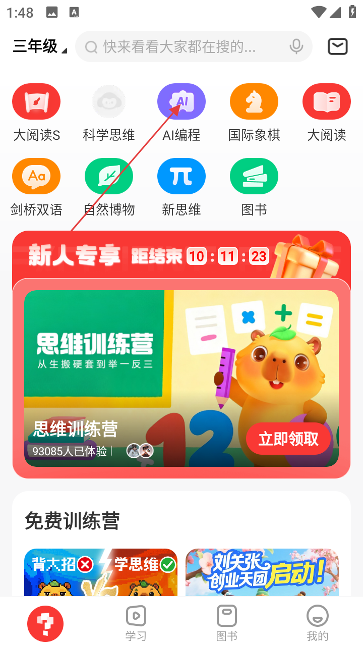1、在学而思网校APP首页,可选择年级,浏览大阅读S、AI编程、国际象棋等课程分类,点击【AI编程】进入相关课程页面。