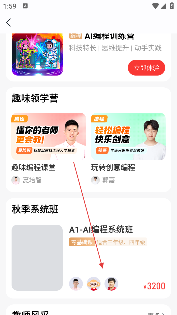 2、在AI编程课程页面,可查看AI编程训练营、趣味领学营、秋季系统班等课程,点击秋季系统班的【A1-AI编程系统班】进入课程详情页。