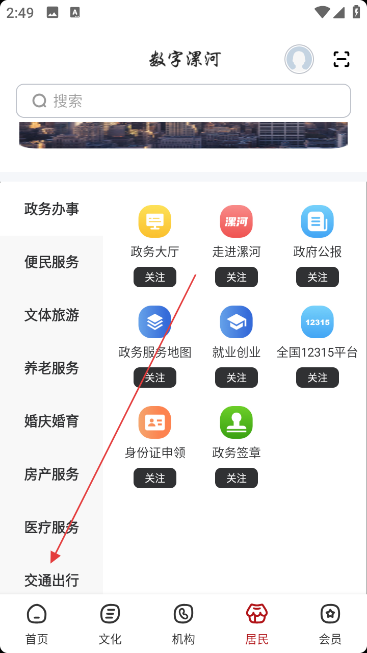 2、在居民页左侧栏,找到【交通出行】并点击,查看交通服务。