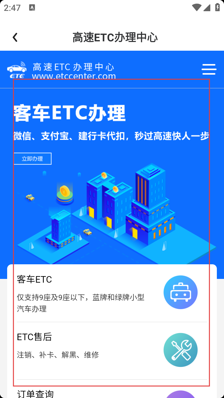 4、跳转至高速ETC办理中心页面,可办理客车ETC或进行售后操作以及进行订单的查询。