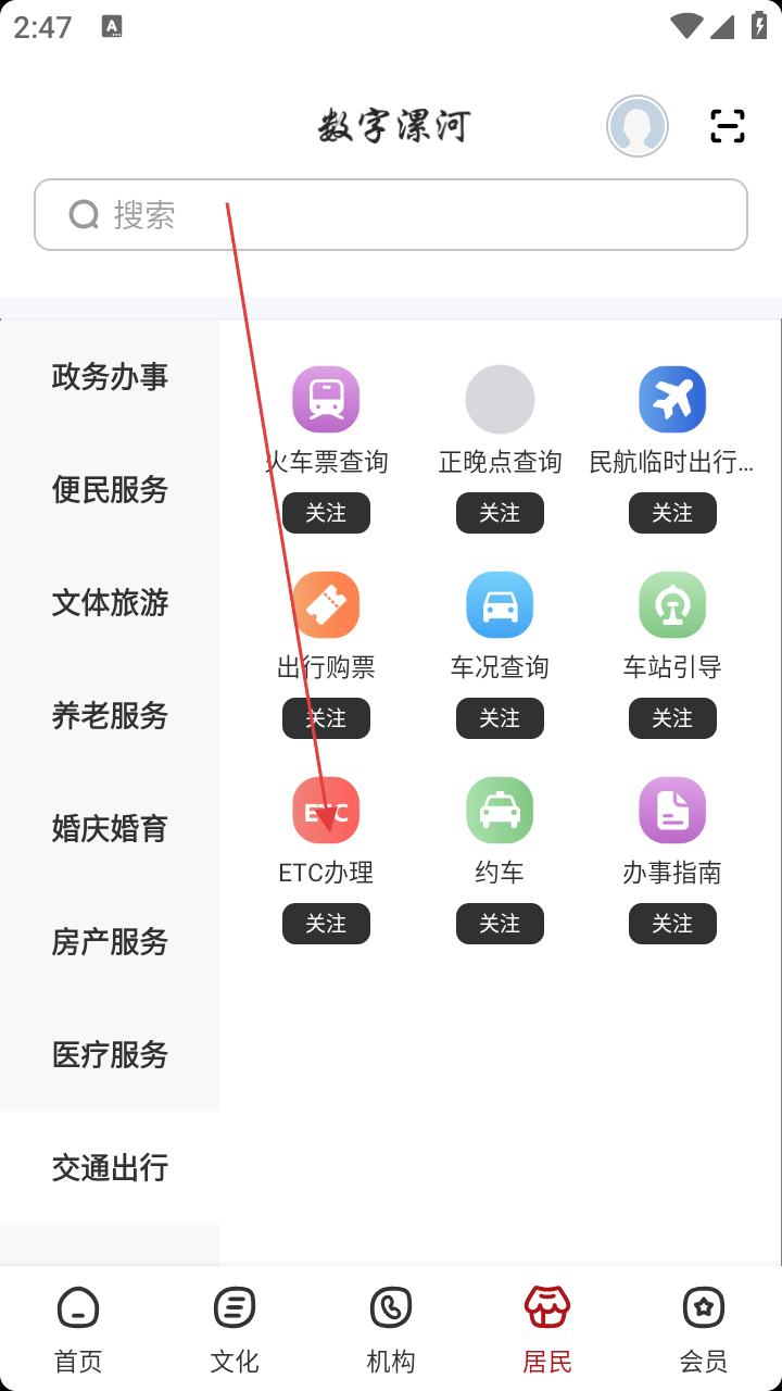 3、在交通出行服务里,点击【ETC办理】,进入办理中心。