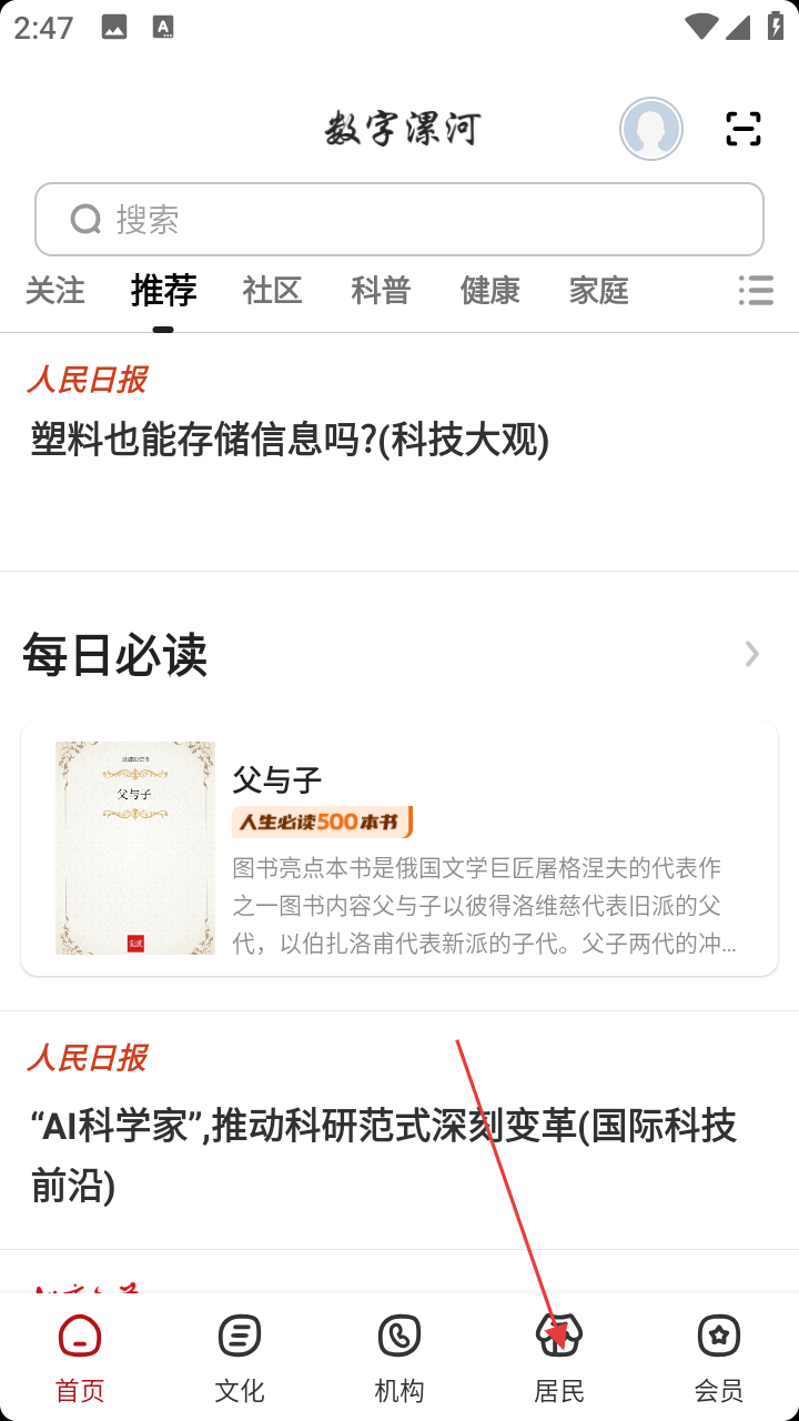 1、打开数字漯河,在底部导航点【居民】,进入居民页面。