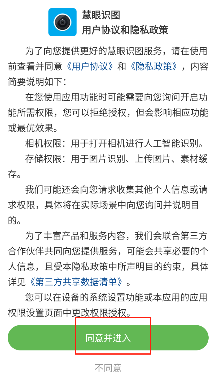 4、开始使用应用:同意所有条款后,进入应用主界面,开始使用慧眼识图功能。
