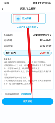 如果用户已经绑定车牌号则直接消耗200积分点击下方提交预约即可,如果没有绑定车牌号,则需要点击上方的车牌号进行输入,输入完毕之后点击提交即可。预约成功后支付停车费即可。