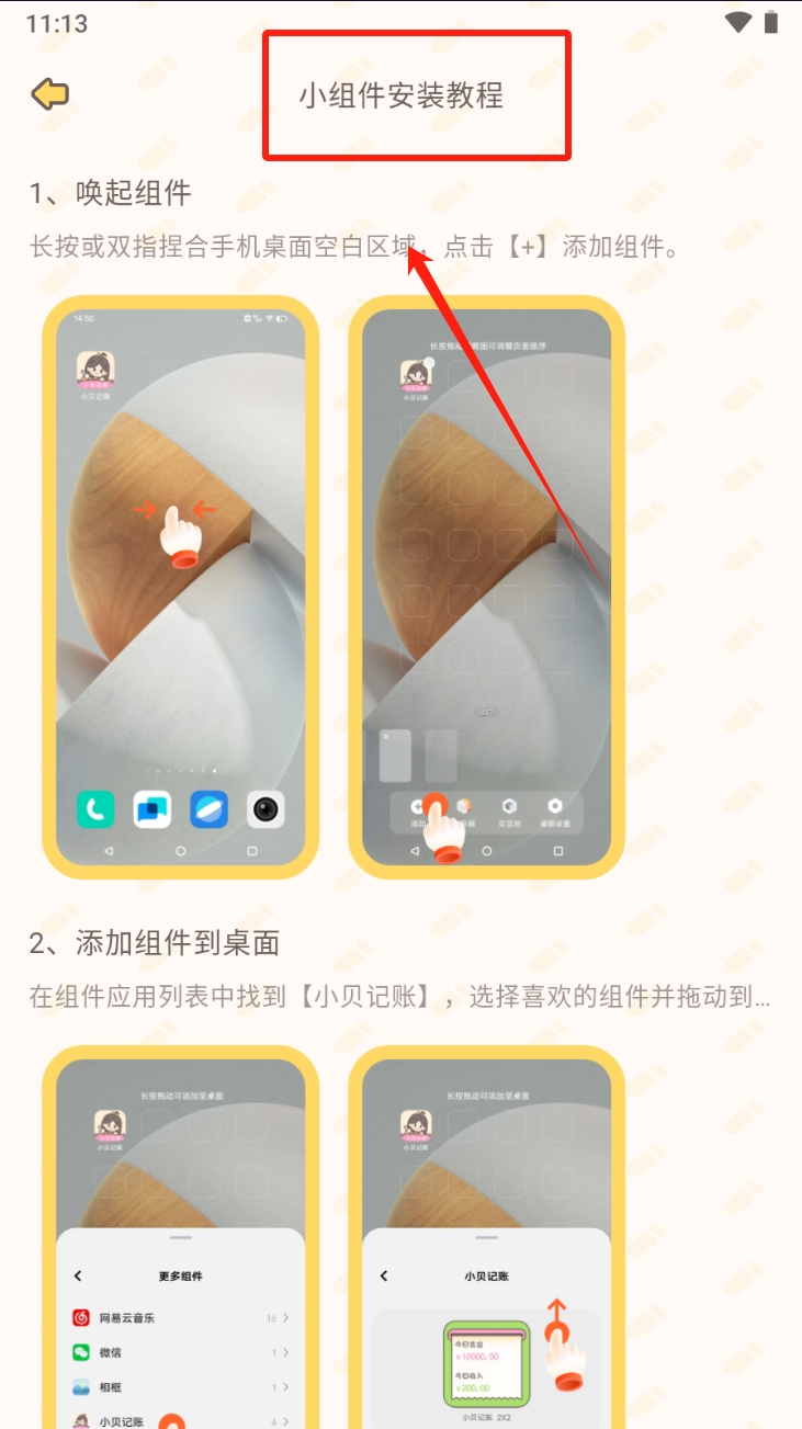 3、阅读“小组件安装教程”并按照步骤将小组件添加到桌面。