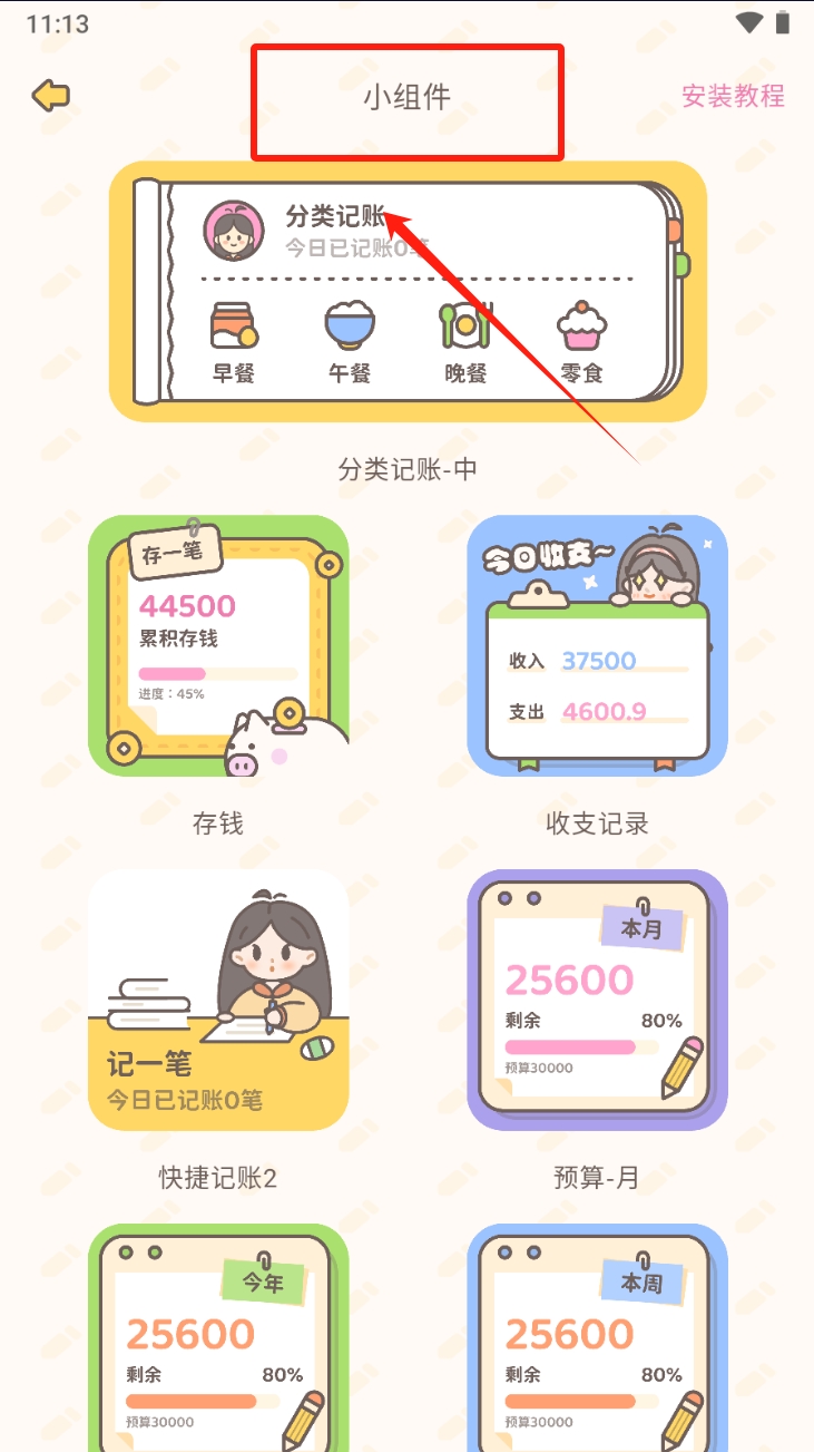 2、在小组件页面,点击“分类记账”以查看不同类别的记账选项。