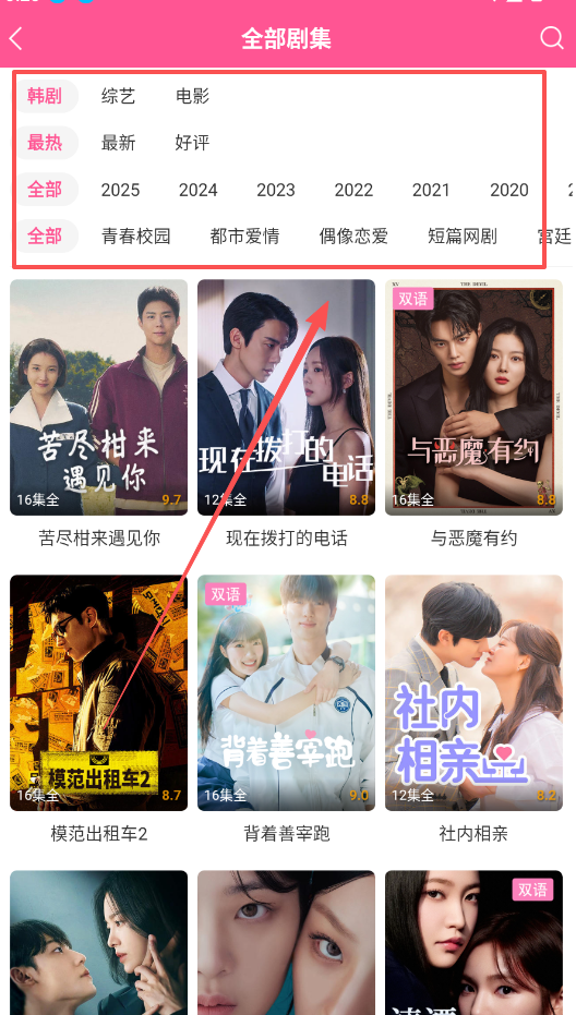 3、进入“全部剧集”界面后,先选择“韩剧”或“电影”等大分类,再结合“最热”排序和“青春校园”等题材标签进行组合筛选。