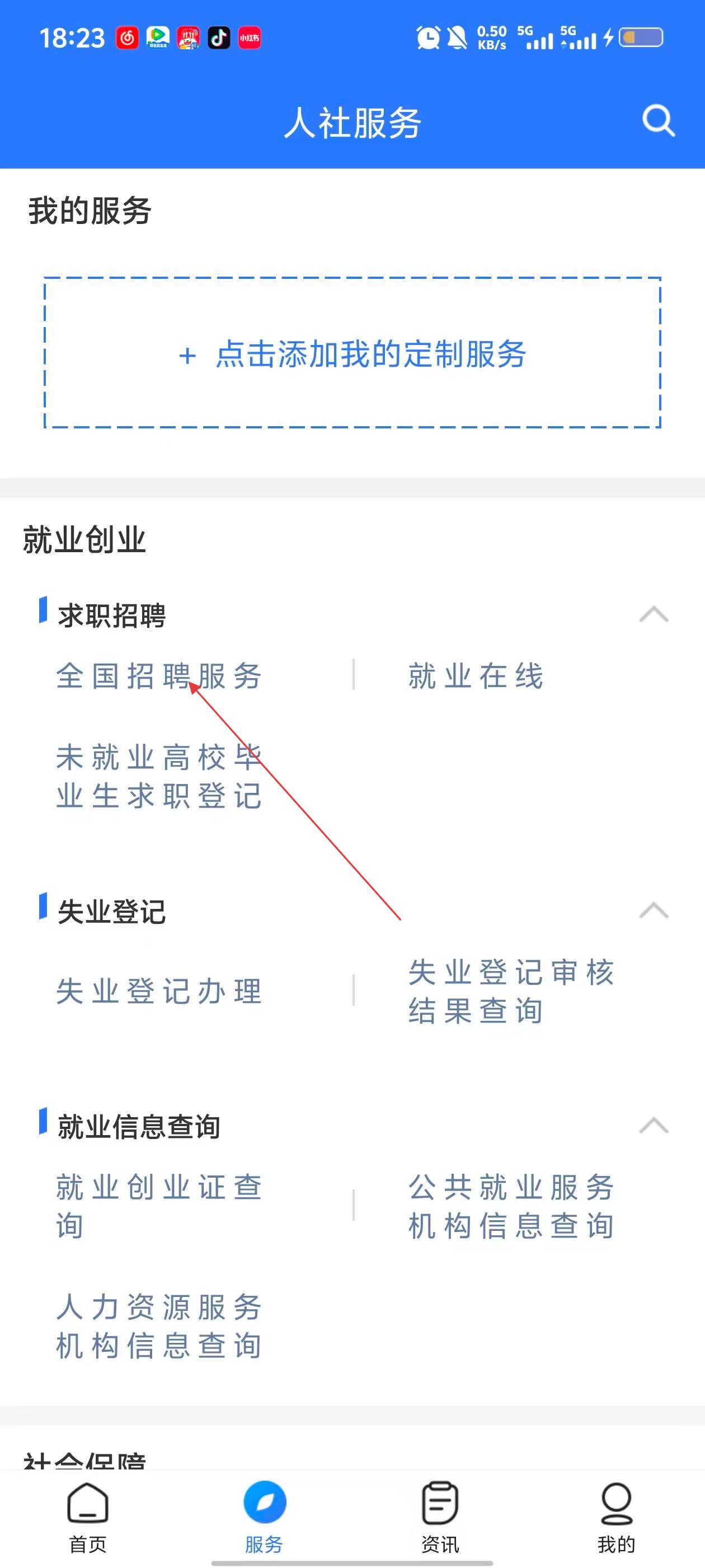 2、在人社服务页面的就业创业板块,点击【全国招聘服务】选项,进入招聘求职界面。